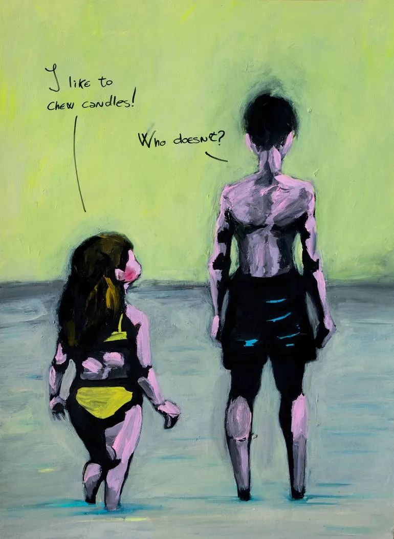 随着他和西比尔的谈话发展,他愈发感到了商品社会中欲望的无孔不入。小说反复提到黄色和蓝色——西摩穿着一条蓝色的泳裤,而他把西比尔黄色的泳衣认成了蓝色的。蓝色代表了纯真,黄色则是香蕉的颜色,代表着欲望。西比尔穿着黄色的泳衣,也不可避免地走向了成人世界的诱惑。她在水里看到了“香蕉鱼”,看到了欲望的化身——随之自己也将逐渐深陷其中,成为香蕉鱼的一员。在那一刻,西摩意识到成人世界正在入侵着西比尔,没有什么可以永远不被玷污——穆里尔、西比尔,都将一个个地被这个社会同化。而他自己也可能成为下一个牺牲品。