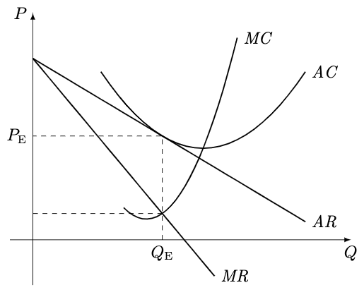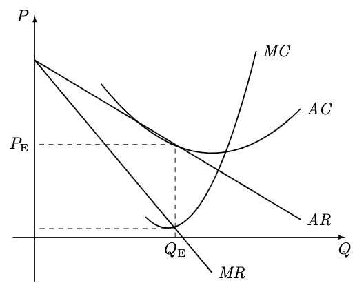 设平衡点为 xE,由于 MC=MR 且 AC=AR: