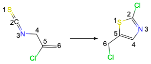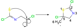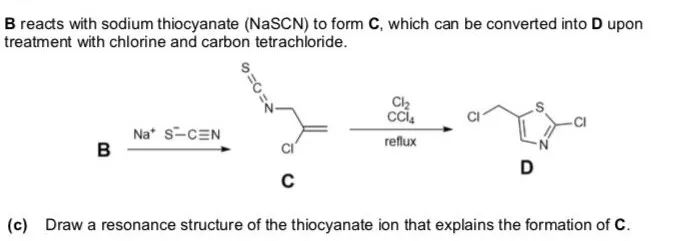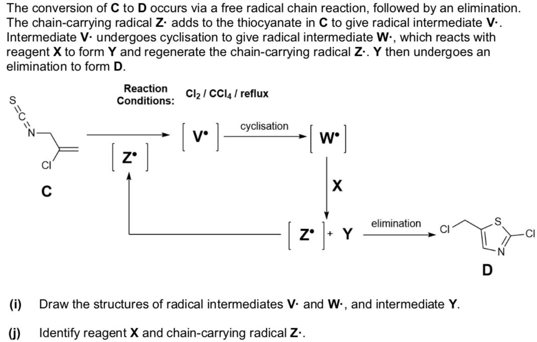由于反应在氯气中进行,我们大胆假设 Z 是 Cl·,再来小心求证。注意题中说 Z 和 C 中的硫氰根部分发生化合,进一步限制了可能的反应。既然要成 C2-Cl 这根键,现在又需要 S, C, N 中任何一个和 Cl 化合,那此时不待更待何时?