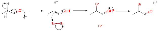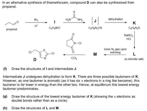 (f) 开始的第一问便造成了暴击——溴究竟是如何与丙醛反应的?我以为是溴加成羰基的双键,但显然根据化学式,I 应该是溴代产物;结果翻阅大本,发现了这么一个机理:参考:大本 P480