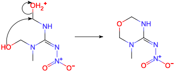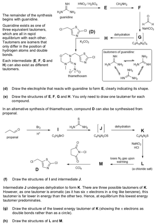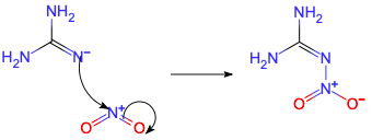 (e) 胍 (guanidine) 当亲核试剂使的话,任何一个氮上的孤对电子都可以进攻硝酰,所以答案不止一个。为了和最后产物的结构一致,选择这种路径。