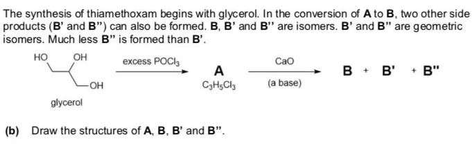 (b) 首先求甘油 (glycerol) 和三氯氧磷 (phosphorus oxychloride) 反应产物。猜都能猜到,POClX3\ce{POCl3} 是氯化羟基的,变成 1,2,3-三氯丙烷。同样没什么难度。(能够方便地卤代羟基的还有 PX5, PX3, SOCl2 等;大本说,二氯亚砜由于发生的是 SNi 反应,并不会翻转)参考:大本 P288