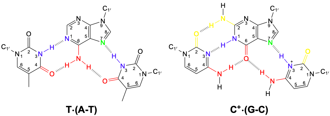 用 Py 代表嘧啶 C/T,Pu 代表嘌呤 G/A,-代表沃森-克里克配对,·代表胡斯坦配对,那么一般在 DNA 中,是 Py-Pu 配对;我们可以再加一个碱基,变成 Pu·(Pu-Py)或 Py·(Pu-Py)。