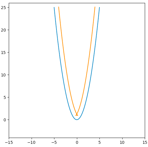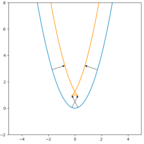 那么临界情况是什么?事实上,尖角正是来自于“消失的点”:如果两条从左右分别移动而来的曲线交汇了,那么就会出现尖角,因此还是要从点消失的条件出发。在抛物线的例子里,如果一个点坐标为,而它的像的横坐标 > 0,那么它消失了。代入变换公式: