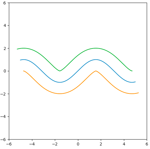 问题 (1) 是因为,当时,曲线上下两部分都“向下”移动,但上半部分“向内”移动,而下半部分“向外”移动,因此拼出了一条不连续的黄曲线;时,得到的绿曲线同理。解决方法,是我们把两组在和的拐点处切分重组,变成一条外侧曲线和一条内侧曲线。