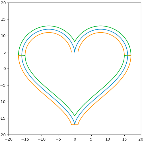 这个坐标看起来很像回事。只要在曲线上多采一点坐标,就可以用 Python 画一条曲线出来。为了检验公式的正确性,我选择了,将这条曲线向外平移 1 个单位。