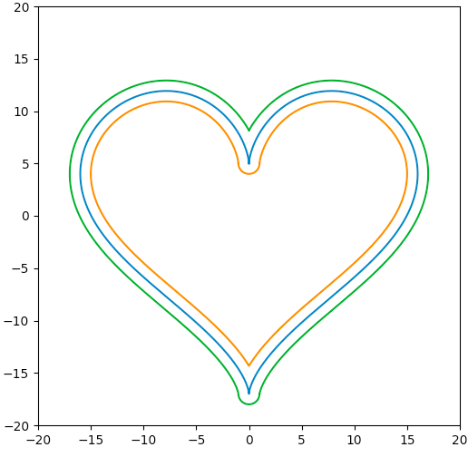 而问题 (2) 更加棘手一点,因为数学上,原曲线在这个突变点左右两边都是垂直向下的,因此向外平移后,它们就应该在顶点的位置无限向下垂直延伸而不该相交。