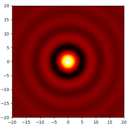 E(x1,y1,z)∝x12+y12J1(zλ2πrx12+y12) 现在,我们只要找到 E=0 的点,就能得到艾里斑的半径。很不幸,贝塞尔函数没有初等表达,更没有解析解。它的第一个数值解为 x=3.8317。算一算: