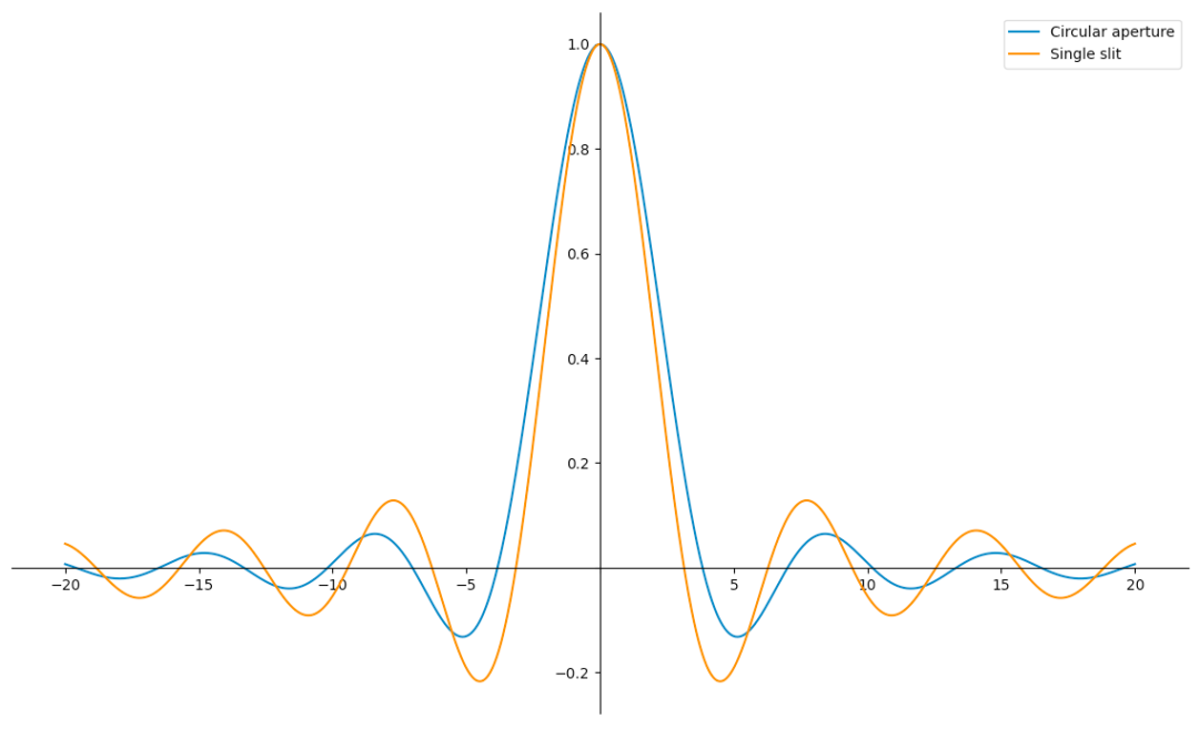 最后,我们画点图验证一下衍射公式。首先是振幅关于轴距离的分布。(光强的分布就是把此函数平方,但画出来的图看起来不够优美)蓝线为圆孔衍射,黄线为单缝衍射,可以看到圆孔的衍射条纹要更宽一点,这个比值正是 1.22。