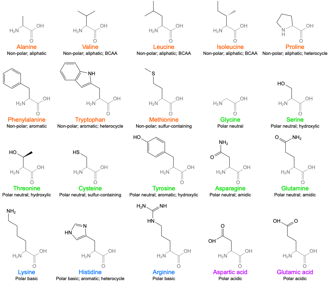 形而上地说,一个氨基酸就是一个同时包含了羧基和胺基的分子。所有生物的蛋白质水解出的氨基酸都是 L-α-氨基酸,也就是它们的胺基都位于 α 碳上,并且 α 碳的手性呈 L 构型。可以这样表示所有的 L-α-氨基酸: