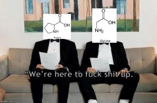 由于氮原子被环锁死,因此它在蛋白中成的 C-N 键不能随意旋转,而是被固定在一个二面角。这使得它成为典型的 α 螺旋破坏者,往往出现在螺旋的最末端。就像这个 meme 所说的: