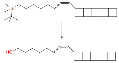 在一顿合成连上了一条侧链后,加入了氟化氢。这里的那条波浪键表示不确定是顺式构型还是反式构型。