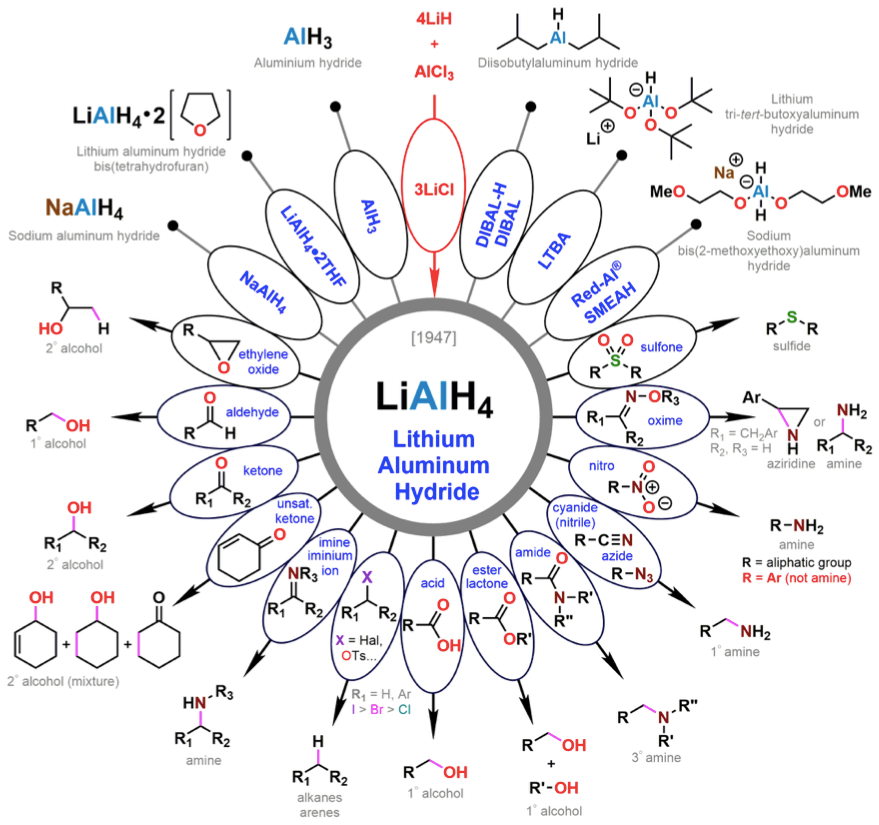 我们从一个羧酸酐(也就是两个羧基脱水后形成的那个五元环)开始。第一步加入氢化铝锂——这应当成为本能,是还原反应。氢化铝锂作为还原剂中的大哥,可以把几乎所有官能团氧化到它们的氧化态顶峰。