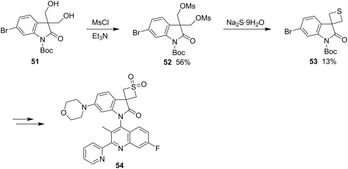 加入了甲磺酰氯,这是个非常常见的甲磺酰化试剂,和羟基反应。同样,即使对甲磺酰氯特性不熟悉,通过对比化学式,也可以知道添加了两个 CH2O2S,正是两个甲磺基。