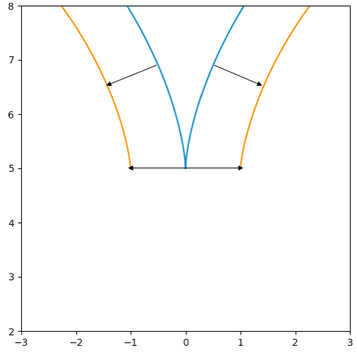 (m,f(m))(m±wf(m)1+f(m)2,f(m)w11+f(m)2)\begin{aligned} \color{red}{(m,f(m))}\mapsto\color{blue}{\left(m\pm w\frac{f'(m)}{\sqrt{1+f'(m)^2}},f(m)\mp w\frac{1}{\sqrt{1+f'(m)^2}}\right)} \end{aligned}