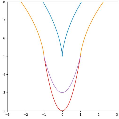 那么临界情况是什么?事实上,尖角正是来自于“消失的点”:如果两条从左右分别移动而来的曲线交汇了,那么就会出现尖角,因此还是要从点消失的条件出发。在抛物线的例子里,如果一个点坐标为(m,m2)(m,m^2),而它的像的横坐标 > 0,那么它消失了。代入变换公式:
