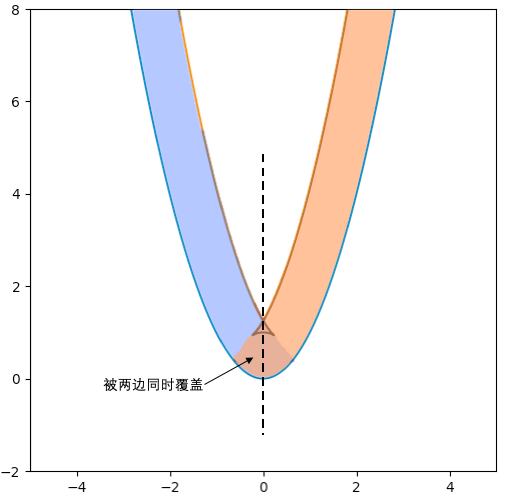 他问,那这怎么解决呢?我告诉他,这些点其实在平移后,像并不应该存在——这个变换过程不是信息对称的,顶点附近的点的信息丢失了。更具体地说,如果一个点在顶点左边,而它的像在顶点右边,那这个点就被从另一边移过来的点“盖住了”,反之亦然。