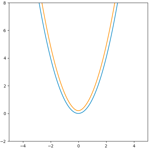 但他仔细看了看,觉得拐点太尖了,显得不自然。只要控制好宽度,应该不会得到那样的尖角。问题是,多大的移动距离会产生尖角?就拿y=x2y=x^2来说,当ww不大时,它向内缩也不会产生尖角。比如w=0.2w=0.2