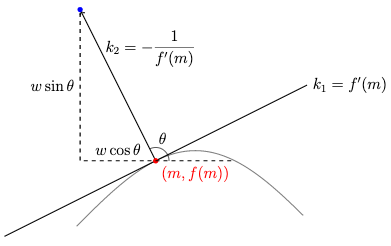 mwf(m)1+f(m)2>ki. f(x)>0:mkf(m)>w1+f(m)2ii. f(x)<0:mkf(m)<w1+f(m)2\begin{aligned} m-w\frac{f'(m)}{\sqrt{1+f'(m)^2}}&>k\\ \text{i. } f'(x)>0: \frac{m-k}{f'(m)}&>\frac{w}{\sqrt{1+f'(m)^2}}\\ \text{ii. } f'(x)<0: \frac{m-k}{f'(m)}&<\frac{w}{\sqrt{1+f'(m)^2}}\\ \end{aligned}